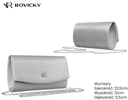 Elegancka kopertówka Rovicky z połyskującego materiału, ozdobiona metalowym logo. Posiada odpinany łańcuszek, umożliwiający noszenie na ramieniu lub w ręku. Idealna na wieczorne wyjścia i specjalne okazje.