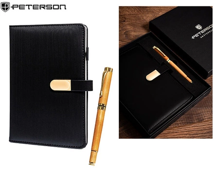 Elegancki zestaw marki Peterson: notes A5 i długopis, całość zapakowana w stylowe pudełko. Idealny do biura, na spotkania i jako prezent. Wysoka jakość wykonania i praktyczny format to połączenie stylu i funkcjonalności.