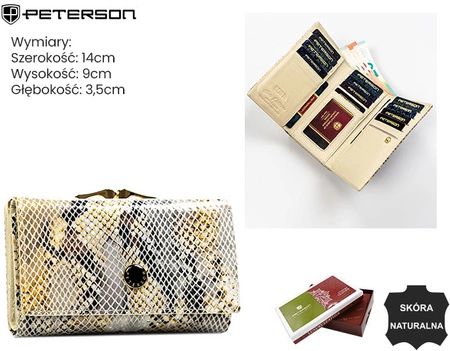 - Wzorzysty portfel damski ze skóry naturalnej. Podzielony na trzy sekcje: dwie zapinane na zatrzaski i jedna na stylowy bigiel. Ozdobiony na froncie biżuteryjnym logo marki w formie okrągłego emblematu. Zapakowany w eleganckie pudełko.