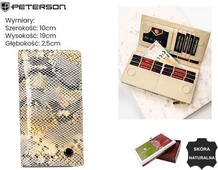 - Elegancki portfel damski marki Peterson, wykonany z wysokiej jakości skóry naturalnej. Zamykany na magnes, posiada liczne przegródki na karty i gotówkę. Całość zapakowana w stylowe pudełko – idealny na prezent.