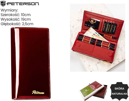 - Pionowy portfel damski skórzany marki Peterson to stylowy i praktyczny wybór. Wykonany z wysokiej jakości skóry, doskonale organizuje karty i banknoty. Zapakowany w eleganckie pudełko, świetny na prezent na każdą okazję.