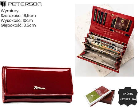 - Portfel damski skórzany marki Peterson to połączenie elegancji i funkcjonalności. Wykonany z wysokiej jakości skóry, doskonale organizuje karty i banknoty. Zapakowany w eleganckie pudełko, stanowi idealny prezent na każdą okazję.