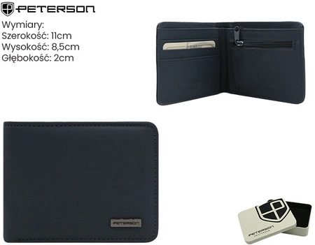 - Portfel męski Peterson z wysokiej jakości skóry ekologicznej. Elegancki, nowoczesny design, zabezpieczenie RFID. Idealny na prezent – zapakowany w stylową puszkę. Funkcjonalny portfel męski z ochroną danych.