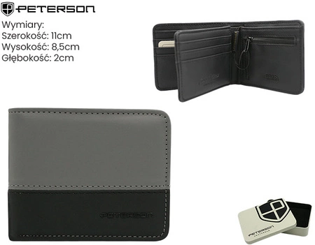 - Portfel męski Peterson z wysokiej jakości skóry ekologicznej. Elegancki, nowoczesny design, zabezpieczenie RFID. Idealny na prezent – zapakowany w stylową puszkę. Funkcjonalny portfel męski z ochroną danych.