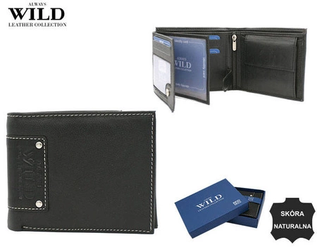 - Poziomy portfel męski bez zapięcia. Wykonany ze skóry naturalnej. Na froncie tłoczenie z logo marki Always Wild. Ozdobiony kontrastowymi przeszyciami. Wewnątrz duża sekcja na dokumenty i schowek na suwak. Portfel z systemem RFID Stop.
