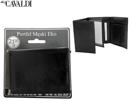 - Portfel męski Cavaldi wykonany ze skóry ekologicznej. Klasyczny model do codziennego użytku, z miejscem na karty i gotówkę. Pakowany na blister – gotowy do sprzedaży.