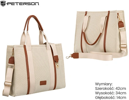 - Pojemna torba shopper Peterson – idealna na zakupy, do pracy i na co dzień. Wytrzymała, stylowa i funkcjonalna, z długimi uchwytami i paskiem na ramię. Komfort i elegancja w miejskim wydaniu.