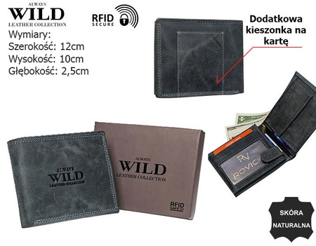 - Portfel męski odszyty z wysokogatunkowej skóry naturalnej nubukowej. Model poziomy zamykany klamerką z zatrzaskiem. Wyposażony w zewnętrzną kieszonkę do płatności zbliżeniowych wyszytą na rewersie portfela. Zabezpieczony systemem RFID.