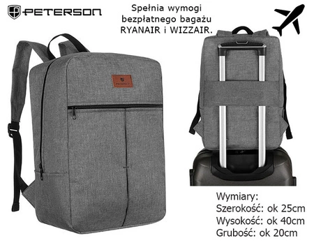 - Jednokomorowy plecak podróżny. Wykonany tak, aby spełniać wymagania linii lotniczych dotyczących bezpłatnego, podręcznego bagażu. Wyposażony w uchwyt na walizkę.