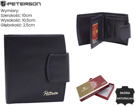 - Kwadratowy portfel z zapięciem na zatrzask. Wykonany z wysokojakościowej skóry naturalnej. Zabezpieczony systemem RFID Protect. Wewnątrz zakładki na karty, dokumenty oraz sekcje na gotówkę.