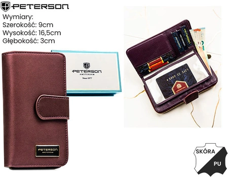 - Duży, pojemny portfel damski Peterson w orientacji pionowej, wykonany z połączenia skóry naturalnej i skóry PU. Elegancki design z praktyczną zapinką – idealny wybór do codziennego użytkowania.