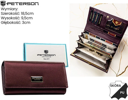 - Elegancki portfel damski Peterson z naturalnej skóry i PU, w orientacji poziomej. Przestronny, z licznymi przegródkami na karty. Idealny na prezent – zapakowany w pudełko. Styl i funkcjonalność!
