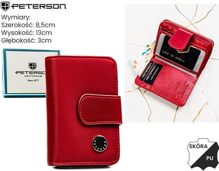 - Pionowy portfel damski Peterson z połączenia skóry naturalnej i PU, zapinany na elegancką zapinkę. Stylowy, praktyczny i zapakowany w pudełko – idealny do sklepu internetowego.
