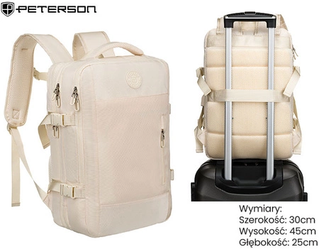 - Plecak podróżny Peterson z wytrzymałej tkaniny poliestrowej. Miękkie, wygodne ramiączka, przemyślany układ kieszonek i praktyczny uchwyt do mocowania na walizce. Lekki, funkcjonalny i idealny w podróży.