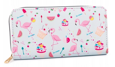 - Duży niebieski portfel damski typu piórnik odszyty ze skóry ekologicznej zdobionej kolorowym printem i złotymi okuciami. Portfel w orientacji poziomej zamykany na suwak. Wyposażony w sekcję na gotówkę,8 przegródek na karty i 2 schowki na większe dokumenty