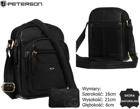 - Torba Peterson w miejskim stylu, wykonana ze skóry naturalnej. Niewielka listonoszka o przemyślanej i praktycznej konstrukcji. Idealna na co dzień – z regulowanym paskiem i etui na klucze w zestawie.