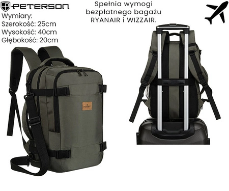 - Plecak podróżny Peterson z wytrzymałej tkaniny. Pakowny i przemyślany, z licznymi kieszeniami ułatwia organizację. Idealny na wyjazdy i codzienne użytkowanie, łączy funkcjonalność z nowoczesnym stylem.