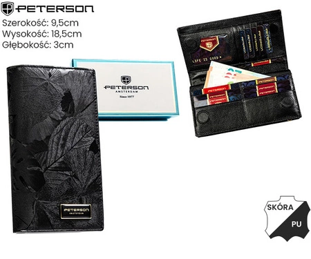 - Duży portfel damski Peterson w pionowym układzie, wykonany z połączenia skóry naturalnej i PU. Zapinany na wygodny magnes, wyposażony w praktyczną kieszeń na bilon na suwak oraz liczne przegródki, które zapewniają porządek i funkcjonalność.