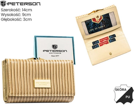 - Portfel damski marki Peterson, wykonany z połączenia skóry naturalnej i eko. Wygodny i elegancki, idealny na co dzień. Zapakowany w estetyczne pudełko – gotowy jako praktyczny prezent.
