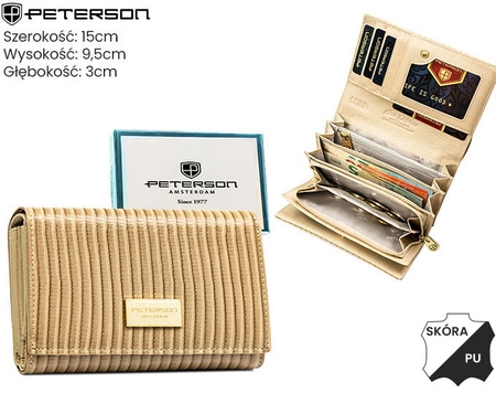 - Portfel damski Peterson ze skóry naturalnej i PU. Przemyślany, wygodny i praktyczny na co dzień. Zapakowany w eleganckie pudełko, sprawdzi się także jako gotowy prezent.