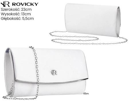 - Klasyczna kopertówka marki Rovicky to połączenie elegancji i funkcjonalności. Idealna na wyjątkowe okazje, wyróżnia się ponadczasowym stylem. Dzięki dopinanemu paskowi-łańcuszkowi można ją nosić zarówno w dłoni, jak i wygodnie na ramieniu.