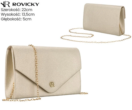 - Elegancka kopertówka Rovicky z połyskującego materiału PU to stylowy dodatek na wyjątkowe okazje. Wyposażona w dopinany pasek z łańcuszka, pozwala nosić ją w ręku lub na ramieniu. Doskonale uzupełni każdą wieczorową stylizację.