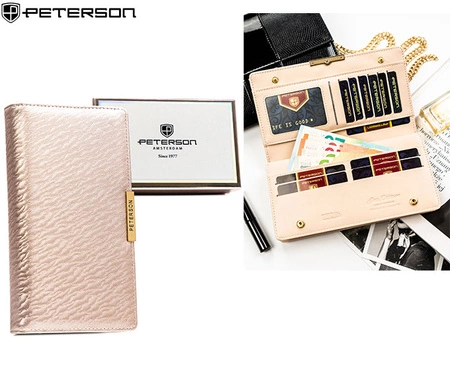 - Elegancki portfel damski Peterson ze skóry eko. Pojemny model z bogatym wnętrzem i wieloma przegródkami na karty. Ozdobiony metalowym logo w kolorze złotym, zapakowany w pudełko – praktyczna i stylowa propozycja dla wymagających klientów.