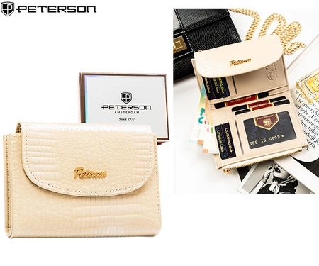 - Zgrabny portfel damski Peterson z wysokogatunkowej, lakierowanej skóry ekologicznej. Praktyczna klapka i wygodne wnętrze z przegródkami ułatwiają organizację. Eleganckie złote logo, całość w estetycznym pudełku.