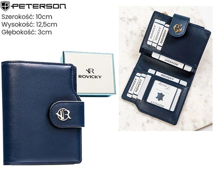 - Poręczny portfel damski marki Rovicky wykonany z wysokiej jakości skóry ekologicznej. Nowoczesny, ciekawy design łączy się z funkcjonalnością – liczne przegródki i kieszonka na bilon zapinana na suwak. Całość zapakowana w eleganckie pudełko.