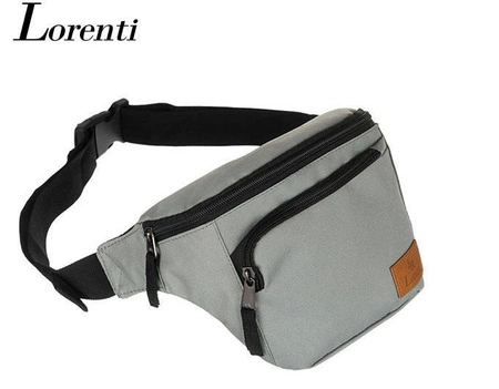 - Saszetka na biodra z tkaniny. Jednokomorowa, zamykana zamkiem błyskawicznym. Na froncie zasuwana kieszonka. Wyposażona w regulowany pasek zapinany klamrą.