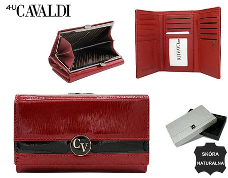 - Czerwona portmonetka damska na zatrzask i bigiel wykonana z lakierowanej skóry naturalnej. Model z rozbudowanym wnętrzem na karty i dokumenty - 17 przegródek i klasyczną sekcją na gotówkę. Portfel mieści dowód rejestracyjny. Pudełko prezentowe.