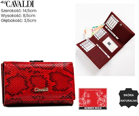 - Portfel w czerwonym kolorze z motywem skóry węża. Odszyty z najwyższej jakości skóry naturalnej i ekologicznej. Środek portfela jest wykończony skórą naturalną, zaś strona zewnętrzna to kolorowa skóra eko. Zamykany na zatrzask i bigiel.