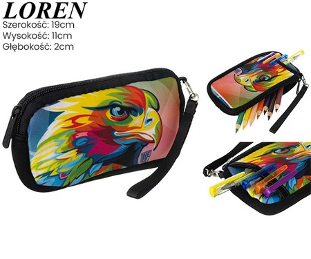 - Praktyczne, poręczne etui wielozadaniowe. Może posłużyć jako niewielki piórnik lub portmonetka. Wykonana z przyjemnego, gąbczastego materiału tekstylnego, posiada dołączony pasek na nadgarstek. Etui wyposażony w wygodną, zewnętrzną kieszeń.
