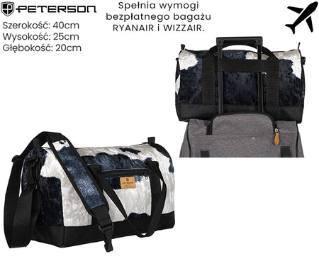- Torba podróżna wykonana z wzorzystego, syntetycznego materiału pokrytego wzorem w łatki. Świetna na bagaż podręczny. Dzięki specjalnej opasce możesz przymocować ją do teleskopowej rączki walizki. Doskonale sprawdzi się również jako torba trenignowa.