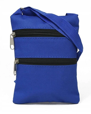 - Etui na dokumenty odszyte z poliestru w niebieskim kolorze. Etui wyposażone w dwie kieszonki zamykane suwakiem. Paszportówka na długim, regulowanym pasku.