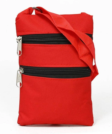 - Czerwone etui na dokumenty, paszportówka odszyte z trwałej tkaniny poliestrowej. Wyposażone w dwie kieszonki na suwak. Zawieszone na długim, regulowanym pasku na ramię.