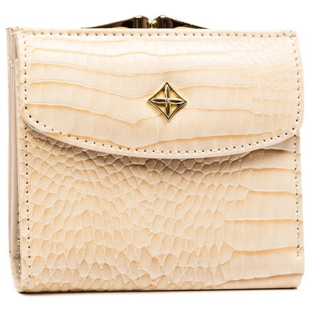- Mały beżowy portfel damski na zatrzask i bigiel. Odszyty ze skóry ekologicznej imitującej skórę krokodyla. Portfel wyposażony w przegródki na karty jak i gotówkę. Zapakowany w pudełko prezentowe.