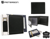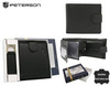 Centralnym punktem zestawu jest portfel wykonany z najwyższej jakości naturalnej skóry w ponadczasowym czarnym kolorze, który przyciąga uwagę swoją elegancją i szlachetnym wykończeniem. Przód portfela zdobi subtelne logo marki Peterson, dodające mu prestiżowego charakteru.