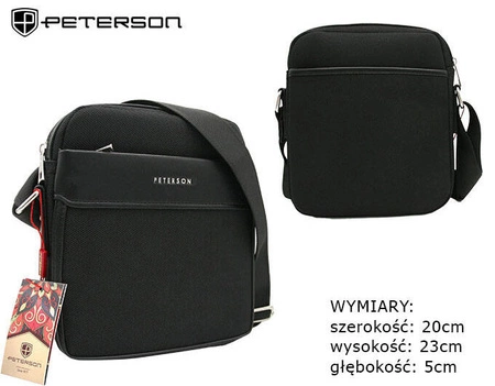 - Czarna torba męska z kontrastującymi srebrnymi okuciami. Wykonana z tkaniny poliuretanowej oraz ozdobiona wstawkami ze skóry ekologicznej. Jednokomorowa, wykończona podszewką. Wyposażona w regulowany pasek na ramię.