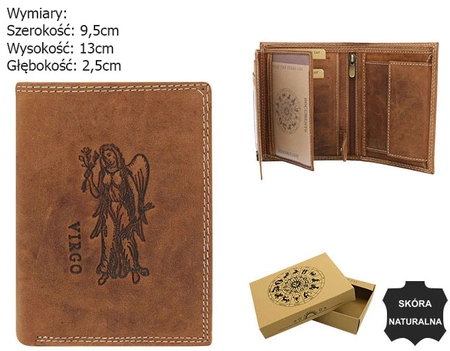 - Portfel w orientacji pionowej. Front ozdobiony grawerem znaku zodiaku Panny. Mieści dowód rejestracyjny. Dodatkowo portfel wyposażony jest w technologię antykradzieżową RFID STOP. Zapakowany w pudełko.