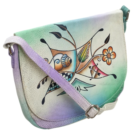 - Ręcznie malowana jednokomorowa listonoszka damska odszyta z najwyższej jakości skóry naturalnej. Wnętrze wykończone podszewką i wyposażane w dwie kieszonki. Na rewersie schowek na suwak. Torebka zawieszona na długim, regulowanym pasku.